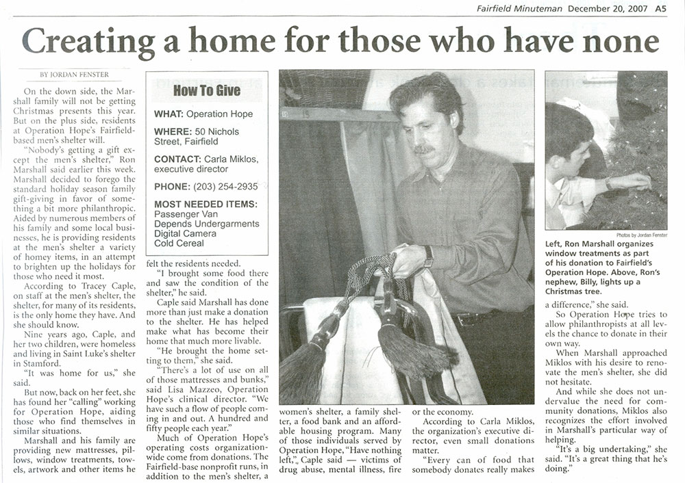 - Funded Operation Hope December 19, 2007, the men's homeless shelter with clothing, bedding, complete interior furnishings and design, Fairfield, CT