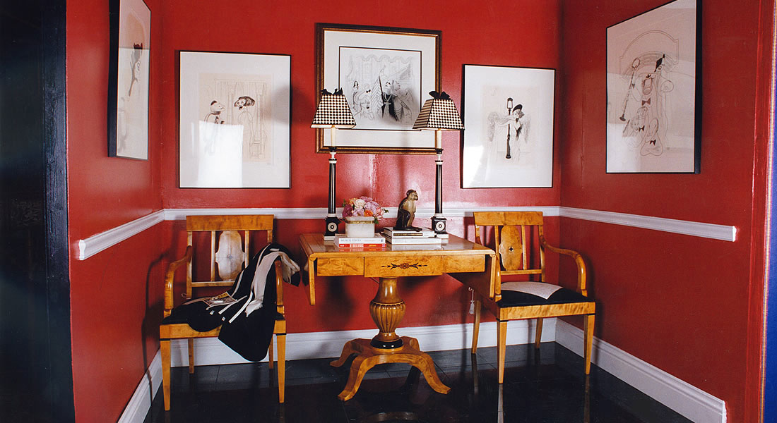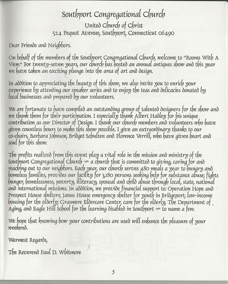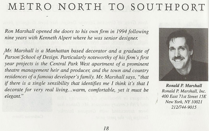 Ron was approached  by his friend, Albert Hadley, to design a small vignette for the Southport Congregational Church's "Rooms With A View" charity. He came up with the concept of "Metro North to Southport".  He was inspired by the idea of a person living in the suburbs but not wanting to miss out on going to the theatre to see a show. Adorning the walls with prints by the artist Al Hirschfeld, whose drawings were seen on the cover of the Arts & Leisure section of the New York Times, gave the small room  a piece of New York culture and arts in one's own home.